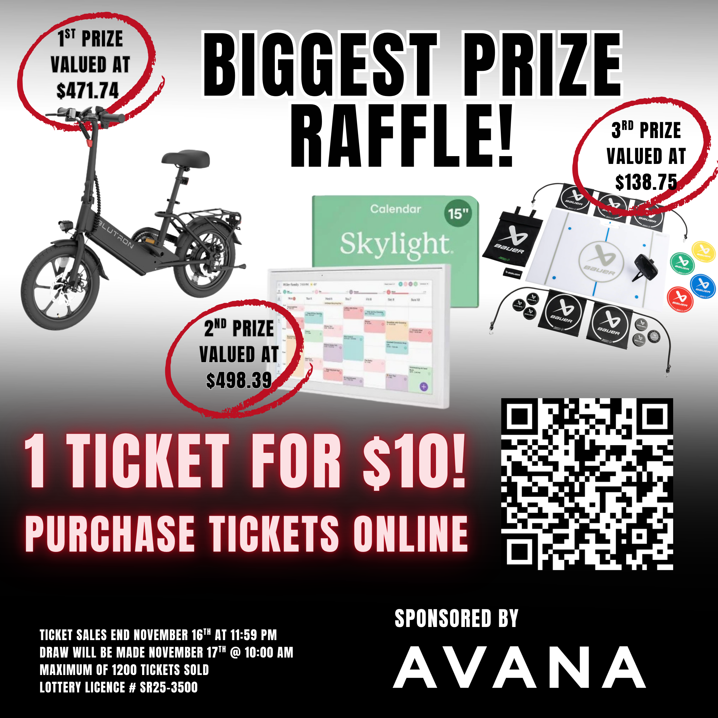 Our Biggest Prize Raffle, proudly sponsored by Avana, is officially live! Tickets are just $10 and only 1,200 are available — get yours before they’re gone! Every ticket supports Prairie Storm Minor Hockey and helps make events like the U11 Classic possible.